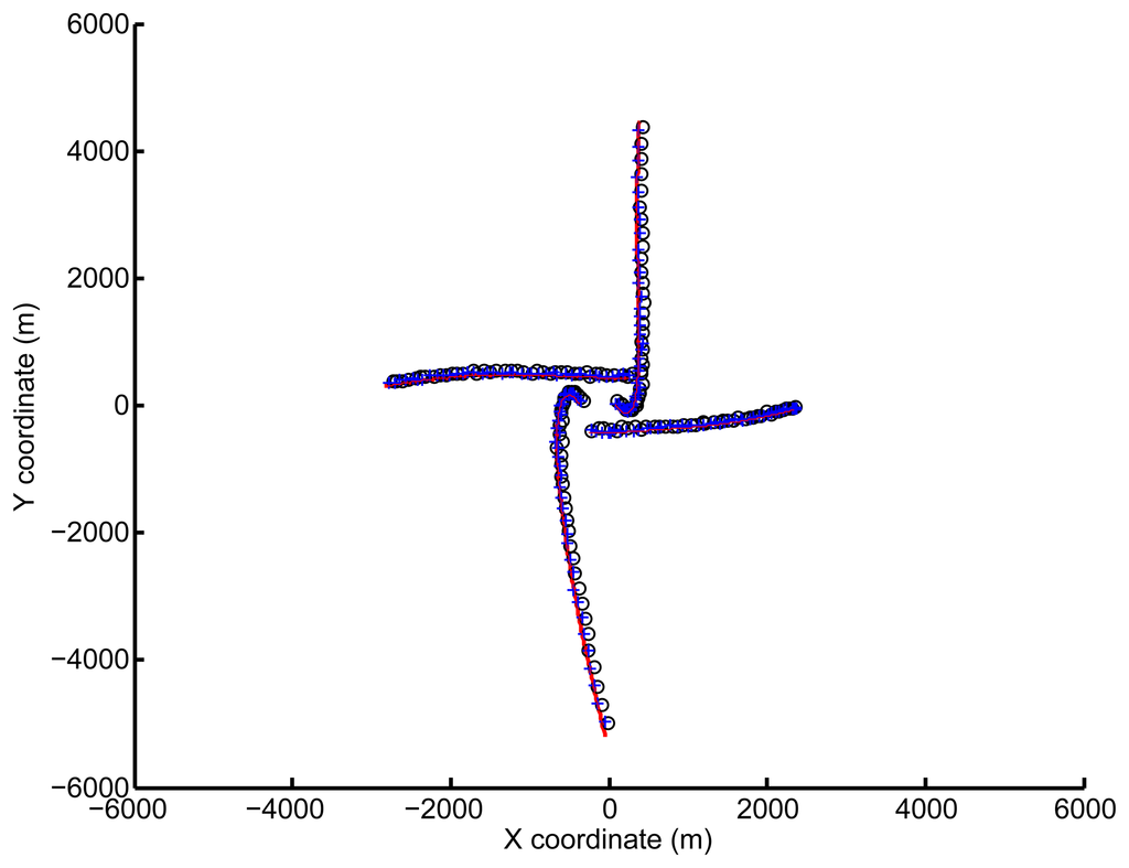 In Figure 4, “+” denotes the vehicle position estimated by the PHD filter after considering spatial registration, while “○” denotes the standard PHD estimation. The solid line denotes the actual vehicle trajectory. The whole trajectory of each vehicle is missing, due to the PHD filter. Compared with standard target tracking methods, the PHD operates on the set space and avoids the association issue. Both observations and estimations are set-valued (for example, although the PHD filter can estimate the number of the vehicles and the corresponding states, it does not distinguish between them. Thus, the identification of a single vehicle over the whole process is not available;. However, for multiple vehicle cooperative localization, keeping the whole trajectory of each vehicle is out of the scope of this paper.