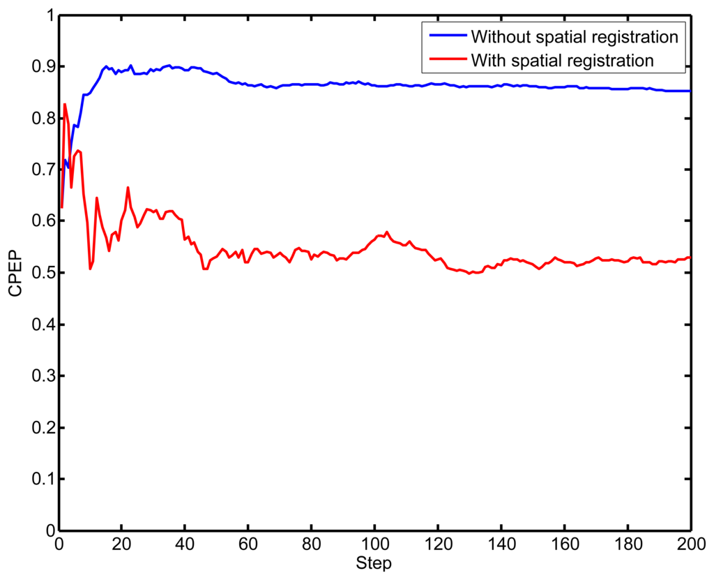 Figure 5 exhibits the CPEP at each step. It illustrates that the CPEP is smaller than the standard PHD by considering the sensors' biases, which exhibits the conclusion that cooperative localization with spatial registration is more close to the ground truth. The standard PHD filter's performance is rather ineffective without considering the spatial registration issue.