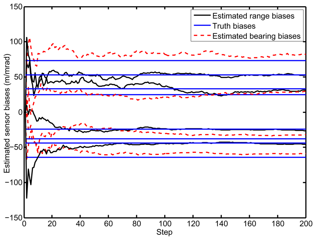 Figure 6 illustrates the estimations of the biases during the whole process. As we can see, the estimated values converge to the true biases in a few steps. After the biases elimination in the proposed PHD filter, the cooperative localization accuracy is significantly improved compared with the standard PHD filter, which is exhibited in Figure 5.
