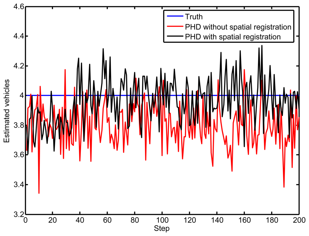 Figure 7 illustrates the number of vehicles, which is estimated by the PHD filter under the data association uncertainty issue. With time increasing, the vehicle numbers estimated by the proposed PHD filter are close to the true number, by the process of bias elimination. However, the performance of the standard PHD filter is imprecise compared to the true vehicle number, without eliminating the sensors' biases.