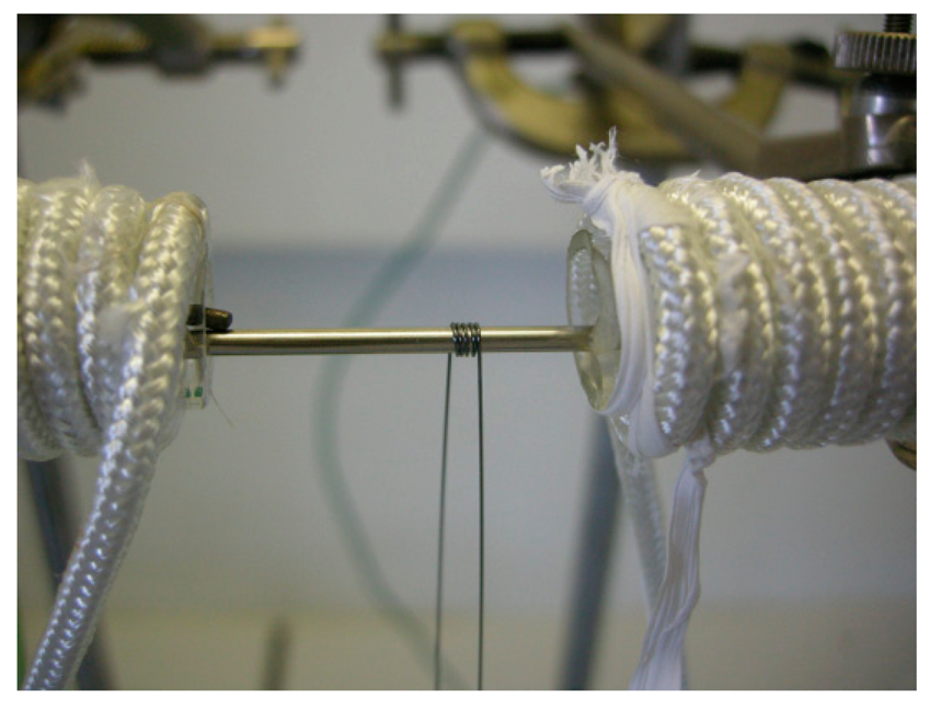 The very good stability of the TAS glass toward crystallization offers the possibility of reheating the glass until its softening point without any optical or mechanical degradation of the fiber, so in order to shape the looped sensing head, the fiber is rolled up along a metallic stem. To achieve this goal, a special furnace has been fabricated. It is constituted by two resistive elements and a steel mandrel with appropriate diameter. Thanks to the resistive elements, the mandrel is heated until the Littleton softening point of the glass, i.e., the η viscosity around 106.6 Pa.s. The initial fiber with a diameter equal to 250 µm is laid down on the mandrel and, when the glass fiber reaches the ideal viscosity, the fiber is rolled up around the steel mandrel. A photograph of the set-up is shown in Figure 1. Following this procedure, one or several U-turn can be done, constituting the looped head of the fiber sensor. To conclude, the temperature is decreased until the transition temperature during a couple of minutes in order to anneal the looped fiber and then cooled down to room temperature.