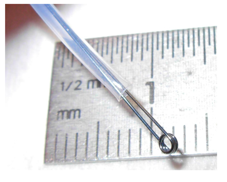 Following the procedure described in Section 2.3, several sensing heads with one, two or three loops have been fabricated. Typically the fiber diameter is 250 µm and the external diameter of the head can be decreased to about 2 mm (see Figure 3). No degradation of the fiber surface is observed.