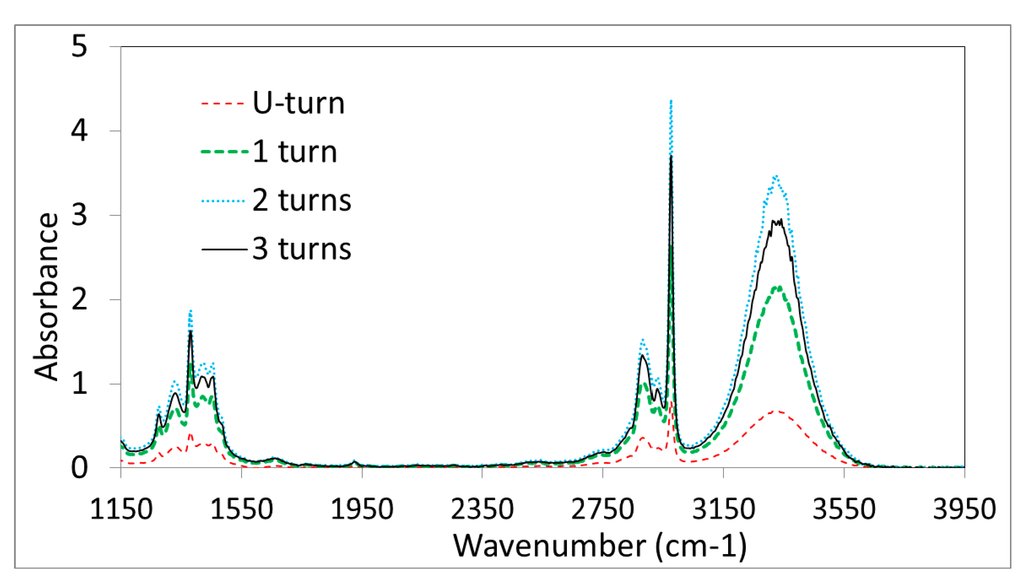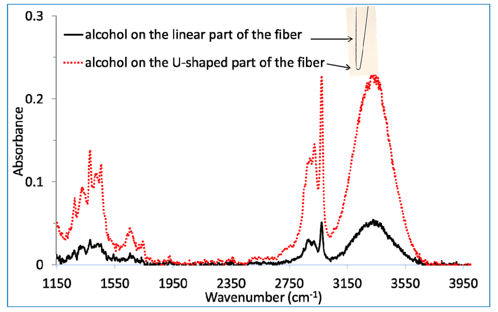 As a first step, a drop of an alcoholic solution, typically 10 µL, has been deposited on the linear part of the fiber as represented in Figure 4. This measurement shows that the fiber with a single U-turn presents a transmission zone between 2 to 12 µm, equivalent to the initial fiber. It allows detecting the three specific absorption bands of ethanol around 1350 cm−1, 2900 cm−1 and 3350 cm−1 (see Figure 4) showing that the shaping at high temperature of the fiber did not degrade the mid-infrared transparency of the fiber.