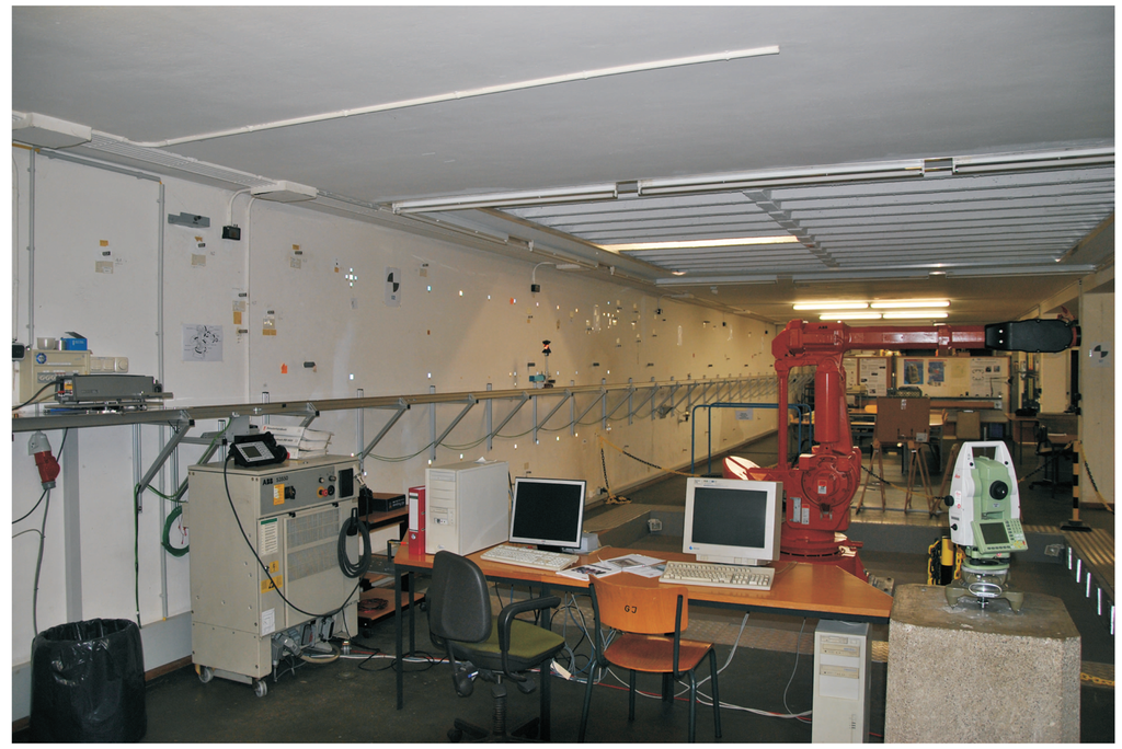 The kinematic observations were performed on a known reference trajectory at the Geodetic Laboratory of the Chair of Geodesy at the Technical University of Munich, Germany; Figure 1. The construction accuracy of the trajectory is 1 mm in both horizontal and vertical position. The “kinematic process” was performed as a tracking problem, with the electronic tacheometer, TCRA1201 Leica Geosystems, used to perform automatic measurements of a moving Leica Geosystems 360°-reflector, installed on a moving trolley. A more detailed description of experimental set-up can be found in [9,10].