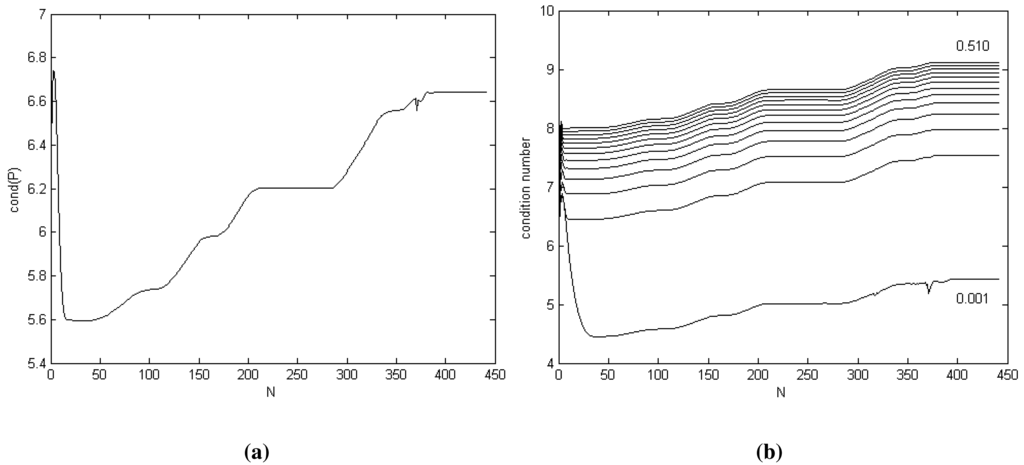 The condition number of matrix for σω = 0.010 is shown in Figure 3a. A large condition number indicates near-singularity. For our KF DWPAM, we determine that the condition number is acceptable. Because the value of the condition number depends strongly on the value of the process noise intensity scalar σω, the value was performed for different values of σω, σω = 0.001 : 0.040 : 0.51; Figure 3b. The lower graph represents the condition number for the lowest σω, i.e., σω = 0.001.