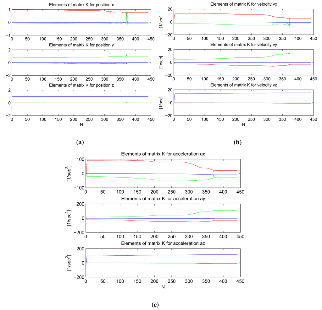 In Figure 4, graphs of the elements of the weighting matrix K are plotted for the position, velocity and acceleration components in all three dimensions. In each graph, the red, green and blue lines represent the element of matrix K for the x, y and z-component of measurement correction. From these graphs, we conclude: