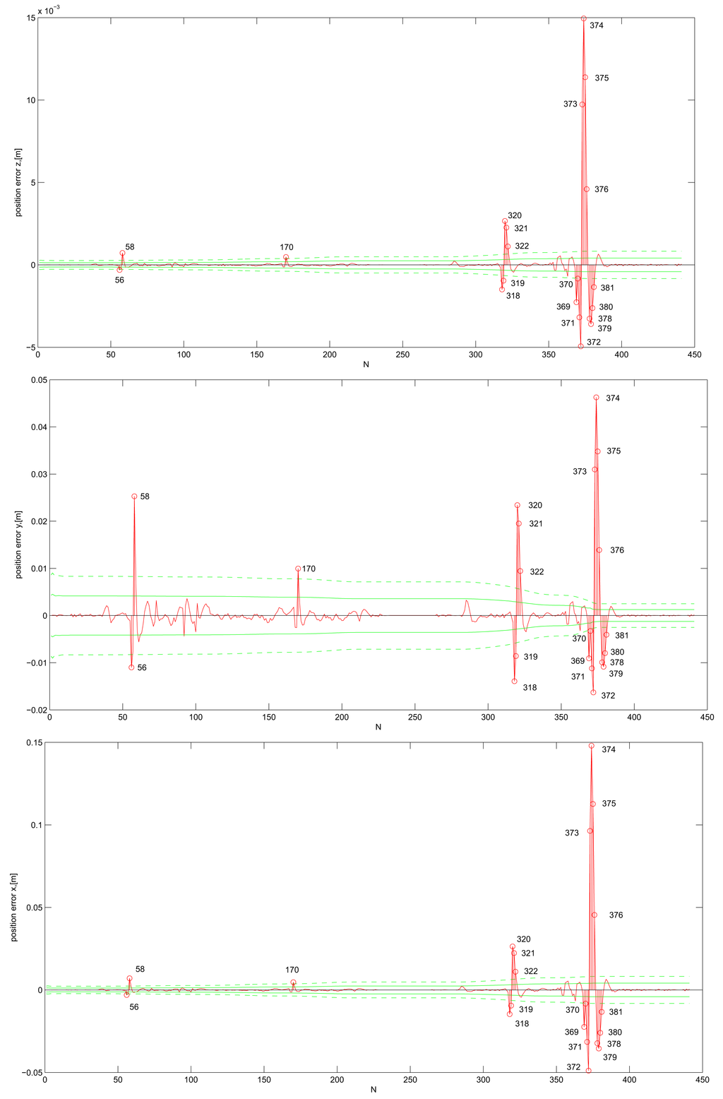 Ideally, variances of the system state estimates should always include the true state within their errors. We visually present this test by plotting the standard deviations of the system state estimates, that is the square roots of the variances, with the estimation error plots. The standard deviations, computed with the KF, indicate how certain it is that the true state lies within a certain distance from the estimated state. The KF is about 66% (95%) certain that the true state element lies within the 1σ (2σ) confidence interval; i.e., within one (two) deviation from the estimated element. If we plot the deviations into the error plot, ideally the error stays under the deviation lines. For KF DWPAM and σω = 0.1, the 1σ- and 2σ-bounds are drawn for each position component separately; Figure 5. Numerical values are given in Table 2. The number of steps, where the position error exceeds the 2σ-bound, is also plotted. In all three figures, the position error is represented with a red solid line, σ-bound with a green solid line and 2 · σ-bound with a dashed solid line. All plots represent cases where no gross errors (large outliers) were present and for σω = 0.1.