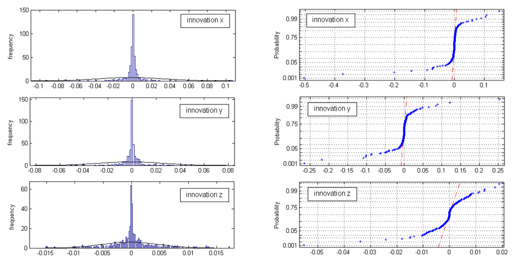 The normal probability plots for all three innovation sets (x,y,z innovation) do not show linear patterns on the whole data; Figure 7. In general, the data are plotted against a theoretical normal distribution in such a way that the points should form an approximate straight line. Departures from this straight line indicate departures from normality. Our data show a reasonably linear pattern in the center of the data, but the tails show departures from the fitted line. In our case, we must deal with short tail normal probability distributed data [13]. In the middle of these plots, the data show a weak S-like pattern. The first few and the last few data on each plot show marked departures from the reference fitted line. In the case of short tails, the first few points overestimate the fitted line above the line, and the last few points underestimate the fitted line. These tail-end outliers may indicate significant deviations from the assumed normal distribution of the measurement innovations.
