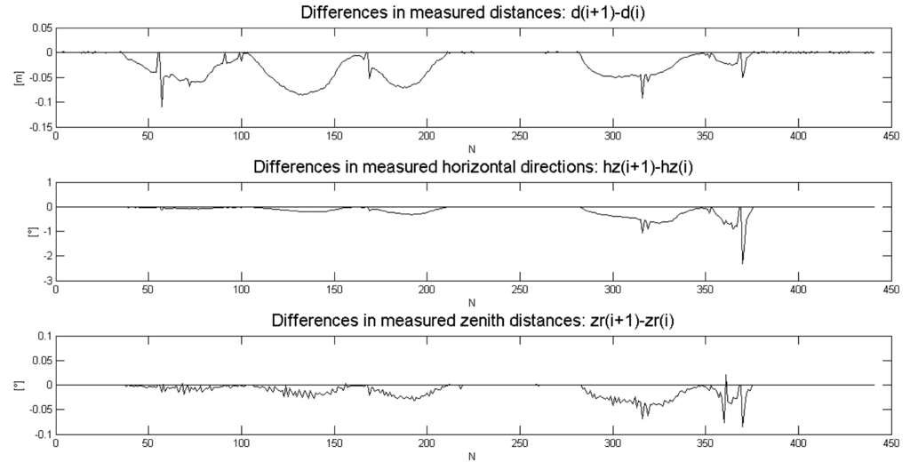 The most direct way to evaluate KF DWPAM accuracy and to find reasons for discrepancies is to use data of direct measurements of distance, horizontal angle and zenith distance and indirect measurements of trolley position on a known reference trajectory In Figure 8, the differences between successive measurement steps k(i + 1) − k(i) of the direct measurements are plotted. The rapid changes in measurements coincide with the observed discrepancies in statistical tests of the model that were discussed above. The reason for these deviations could thus lie in model, in direct observations or in the true motion of the trolley. True trolley motion might have included jerky changes in the inclination of the reflector. This is particularly possible in the x-direction, perpendicular to the trajectory. From our observed changes in direct (KF) measurements (Figure 8) and indirect measurements (Figure 9), we conclude that the reason for the KF DWPAM inconsistency lies in the actual discontinuous motion of the trolley. The KF model cannot follow rapid changes in motion very quickly; consequently, when fast changes occur, bigger values of differences between predicted and true measurement also occur, as in the case of continuous motion.