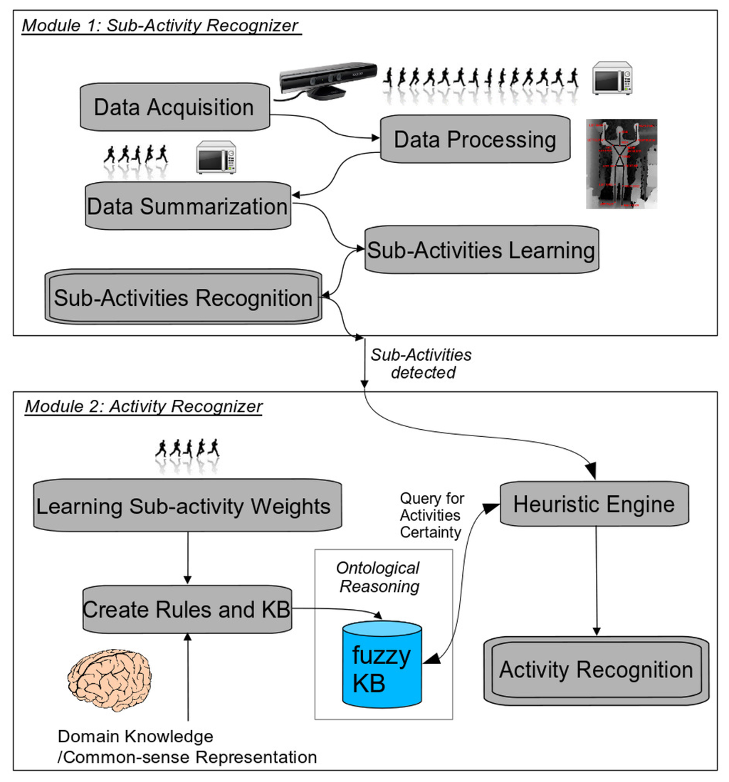 Our work is motivated by a lack of proposals tackling motion detection at the same time as figuring out the actual meaning of these activities, taking imprecise context into account. In addition, by considering context and a proper management of uncertainty, we will avoid the need for re-training the system when new input data or models change, according to the context. Therefore, our framework consists of two well-distinguished modules, described in the next two sections. The first modules will recognize low-level activities, with no specific meaning within a context, nor a complex activity definition associated. The second module will provide meaning to sequences of sub-activities to infer the significance or purpose of high-level complex activities.
