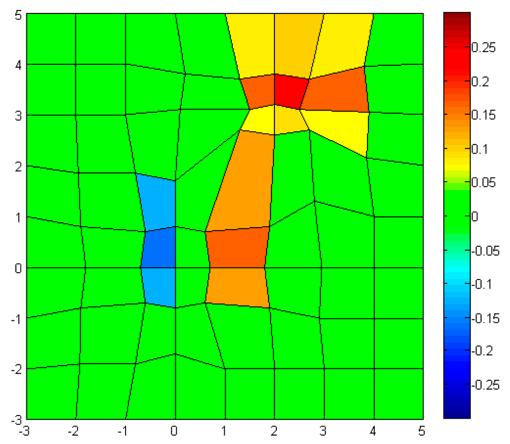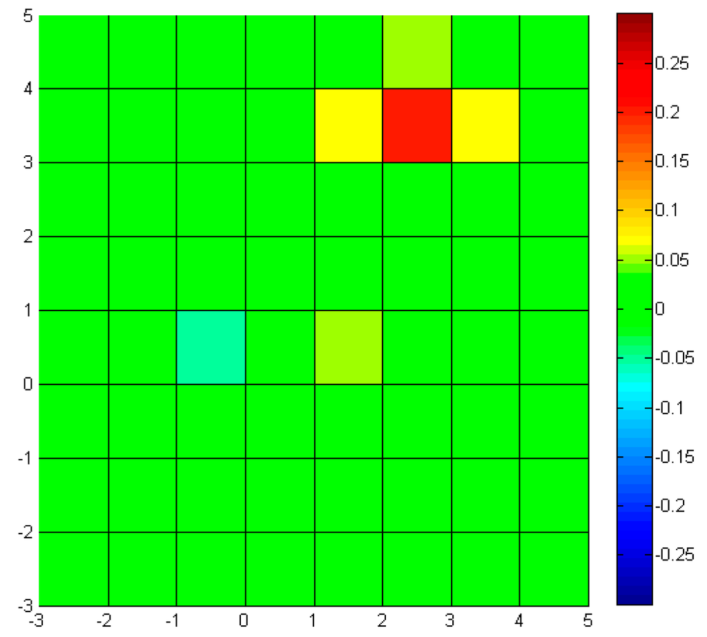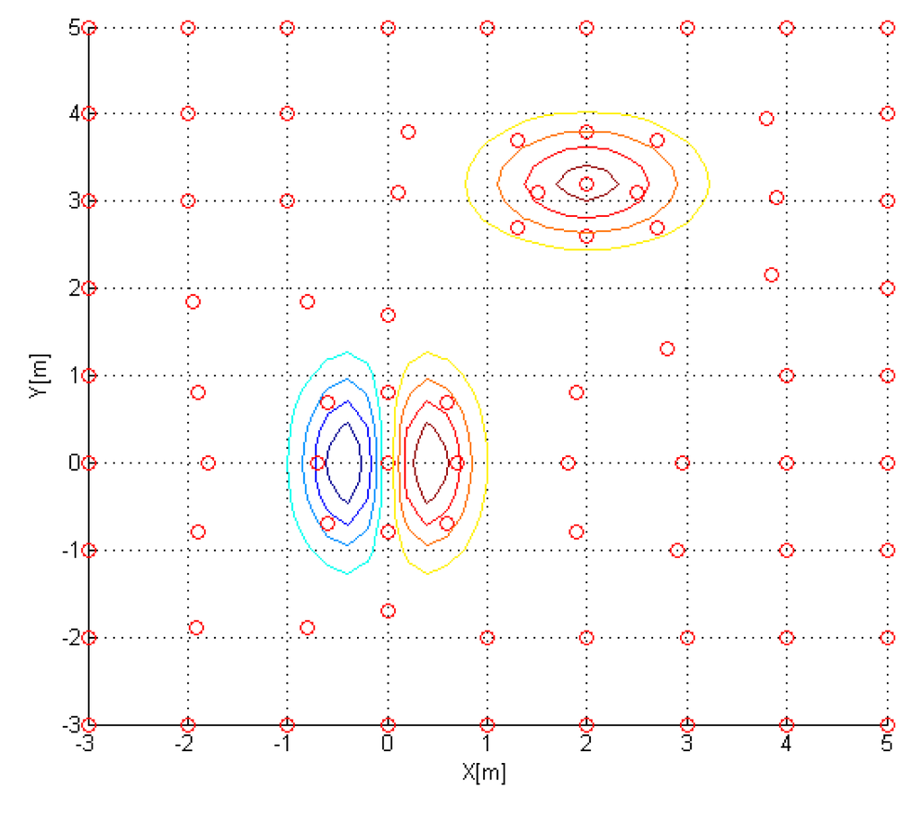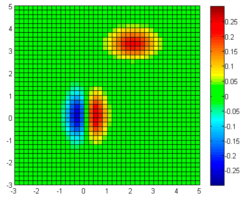 In order to show the effectiveness of the sensor node reconfiguration, the measured properties are compared in the following figures. For reference, the environment model is presented in 2D plot with color bar in Figure 10. The environment model is composed of 41 × 41 cells. The green cell shows the region with value of 0, while the red and blue shows higher and lower values respectively. With the initial (evenly distributed) sensor nodes, the measured properties are shown in Figure 11.