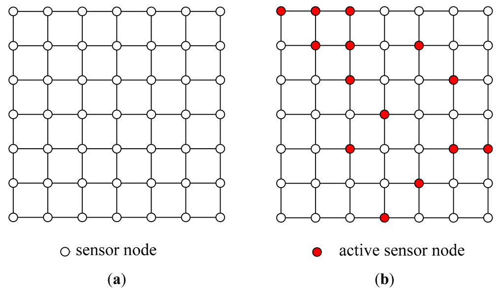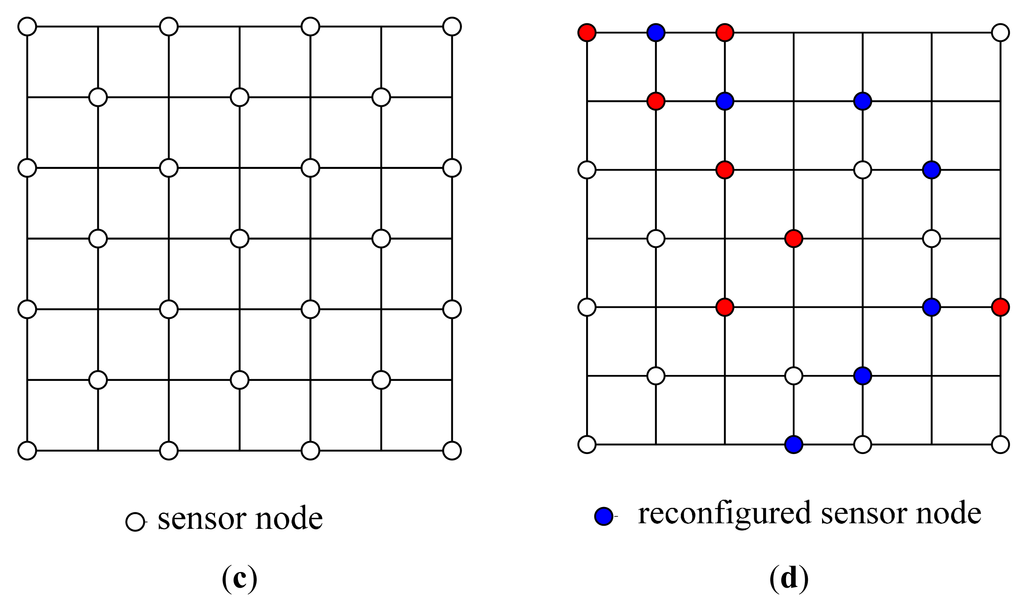 As the area to be monitored gets larger, the number of sensor nodes grows. Thereby the power source and the range of the wireless communication become more important. In case humans can’t reach an area to install the sensor network, it is also used to deploy the sensor nodes from the air. A more efficient way of using a sensor network is enabling only the necessary nodes in order to save power and reduce the communication load. For example, a sensor network with 7 × 7 nodes (Figure 1a) is composed of 49 nodes and only some of the nodes (Figure 1b) are activated to collect information. The selection of nodes is carefully planned to get the maximum throughput while minimizing the power consumption with given constraints. Another way of managing the sensor network is the reconfiguration of the nodes using the nodes with mobility. Figure 1c shows a sensor network with a less number of nodes than the one in Figure 1a. For the same set of nodes to be used as in Figure 1b, some nodes (red) are selected, and some nodes (blue) are moved. The goals of reconfiguration are maximizing the sensitivity and the resolution, while minimizing the operating power consumption and the total time of measurements.