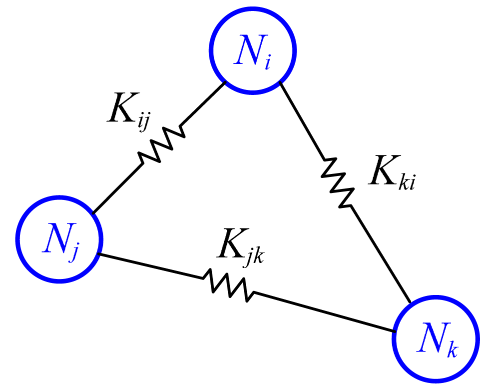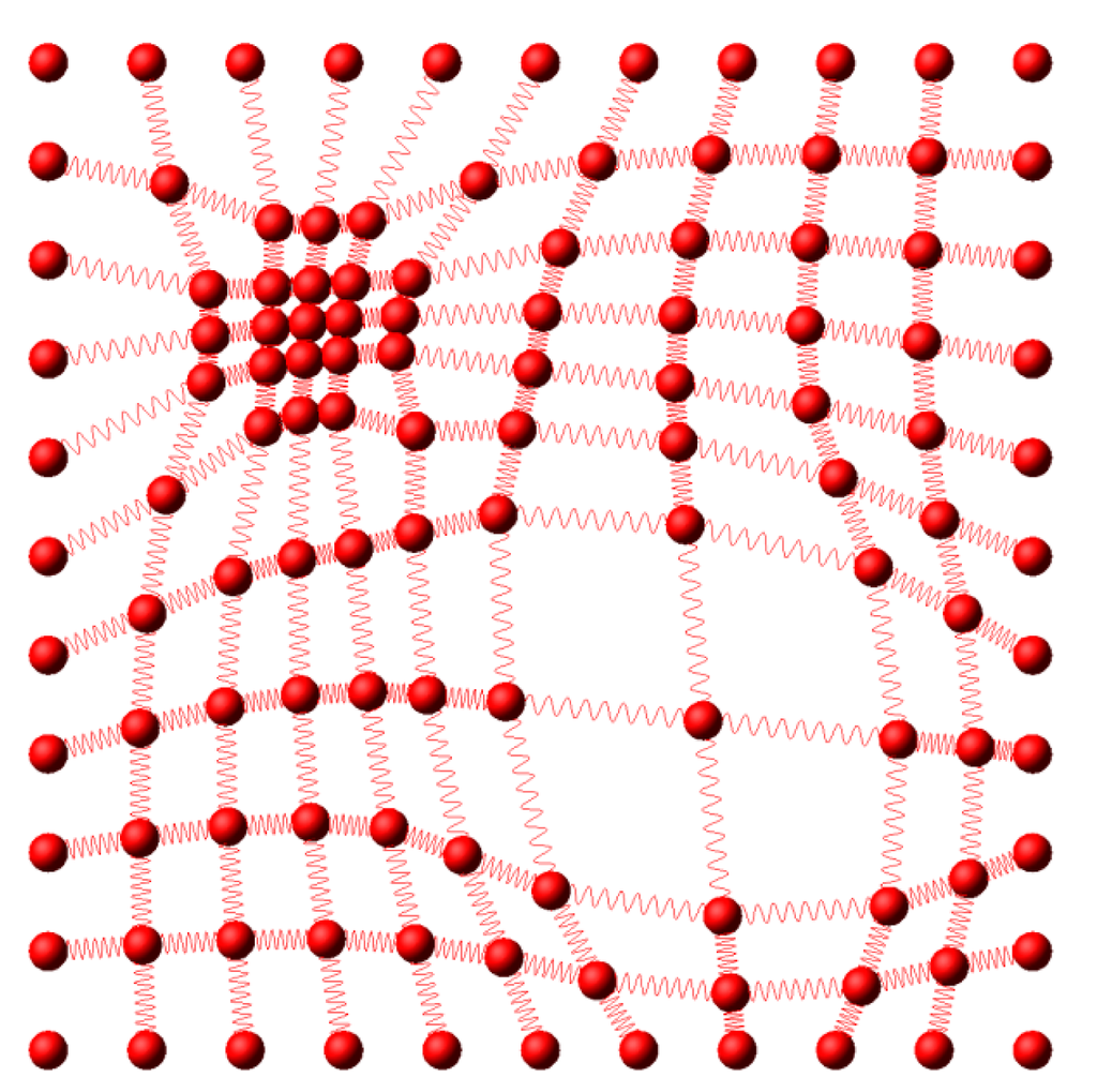 The initial spring length is do. Therefore, the spring force is zero when the distance between two nodes is do. If the other node is closer than do, they push each other, while they pull each other if it is farther than do up to dr. The spring force is set saturated for ranges of ds ∼ dr. No interaction is set farther than dr. The spring constant K and the offset value, do are set appropriately so that the distance between nodes are controlled and thereby the density of nodes are as desired. The location of the node is updated as: