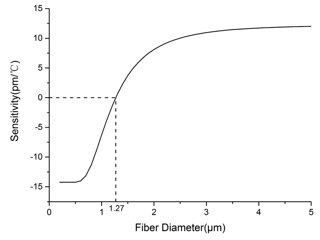As shown in Figure 1, with the fiber diameter of 0.20–1.27 μm, the sensitivity decreases with the increasing fiber diameter; however, with the fiber diameter of 1.27–4 μm, the sensitivity increases with the increasing fiber diameter; and with the fiber diameter larger than 4 μm, the sensitivity increases with the increasing fiber diameter slowly. In other words, the sensitivity changes little by increasing the fiber diameter when the fiber diameter is larger than 4 μm. The reason is that the silica and seawater show the opposite thermal response due to their opposite TOCs. The resonant wavelength shifts toward the long wavelength (red shift) when the positive TOC of silica dominates, and the resonant wavelength shifts toward the short wavelength (blue shift) when the negative TOC of seawater dominates. The microfiber with smaller diameter has more power transmitted in seawater due to the stronger evanescent field effect. The evanescent field and the influence of the negative TOC of seawater becomes weaker with increasing fiber diameter, which leads to the transformation of the resonant wavelength from red shift to blue shift. To obtain high sensitivity, microfibers with diameters ranging from 2.5 μm to 4 μm are chosen.