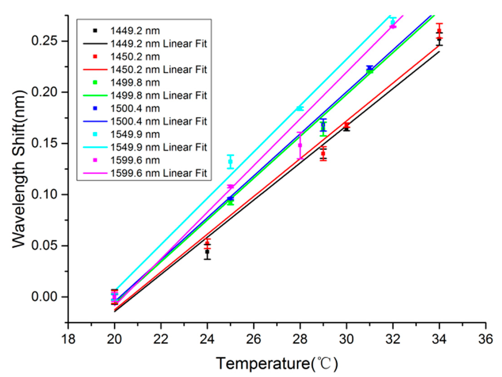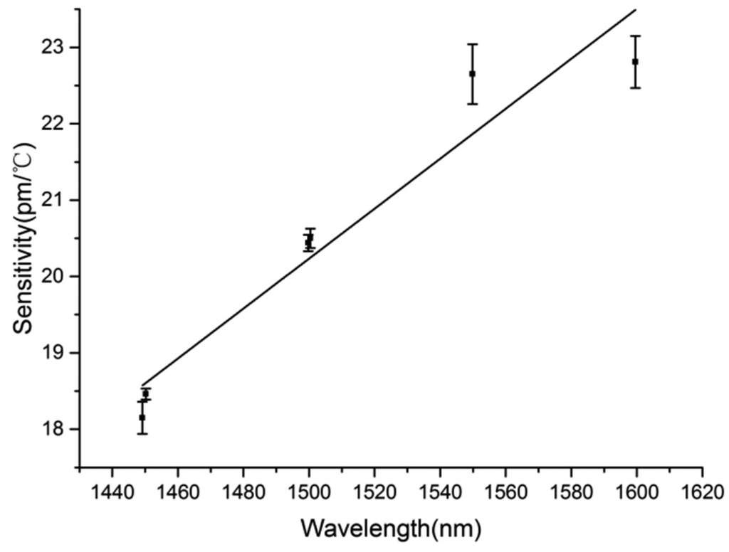 Similar to the fiber diameter, probing wavelength is an equivalent parameter that determines the sensitivity. To reveal the dependence of sensitivity on probing wavelength, we firstly measure the wavelength shift with the temperature to obtain the sensing sensitivity of a 473-μm-diameter MKR with 3.91-μm-diameter microfiber around probing wavelengths of 1449.2, 1450.2, 1499.8, 1500.1, 1549.9 and 1599.6 nm, respectively. Correspondingly, the measured sensitivities are estimated by the slopes of the fitting lines shown in Figure 9, which are 18.15, 18.46, 20.44, 20.5, 22.65 and 22.81 pm/°C, respectively. Based on the sensitivities, we plot the dependence of sensitivity on the probing wavelength in Figure 10. It is obvious that sensitivity increases approximately linearly with the increase of wavelength, which is also consistent with the simulated results shown in Figure 2.