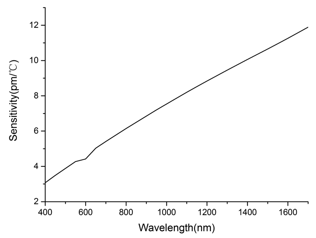 Due to the fact that 97% of seawater is pure water and there is no research results of the relationship between the RI and temperature of seawater in infrared band, we use the RI of pure water [31] instead of the RI of seawater approximatively. The losses in the MKR, including guiding loss, bending loss, and absorption loss have no influence on the sensitivity of the sensor. Thus, the losses are not considered in theoretical calculation. Combining Formula (1) and the analytic equation of propagation constant [32], the dependences of sensitivity on fiber diameter and probing wavelength are obtained, as shown in Figures 1 and 2. The MKR diameter does not affect the sensitivity of the sensor, because sensitivity mainly relies on the strong evanescent field outside the microfiber [10].