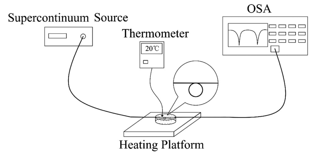 The schematic diagram of the experiment system is shown in Figure 3. The instruments in the system include supercontinuum source (SuperK™ Compact), optical spectrum analyzer (AQ6370C), temperature-controlled heating platform and thermocouple thermometer. The MKR is prepared under an optical microscope with the aid of fiber probe as follows: firstly, microfiber is fabricated by flame stretching method from standard single mode fiber. Then, the freestanding end of the fiber is fabricated into a relatively large loop about a few millimeters in diameter, which is then tightened into a smaller knot by pulling the free end of the fiber. After this manipulation, a MKR is obtained [33]. One side of the MKR is connected with the supercontinuum source, and the other side is coupled to the optical spectrum analyzer for signal collection. Finally, the assembled MKR is immersed in seawater and the vessel of seawater is placed on the heating platform. The seawater temperature is varied by changing the temperature of heating platform, and the real time temperature is monitored by the thermocouple thermometer. The salinity of seawater sample used in the experiment is 34‰, which was measured by salinity meter (PR-100SA).