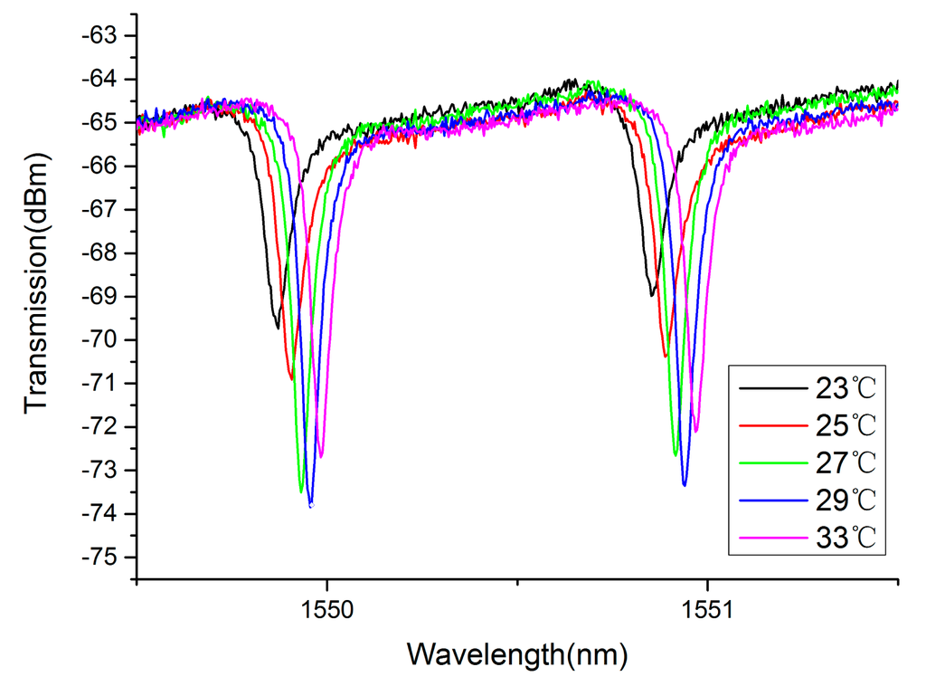 It is noticed that besides the resonance wavelength shift, the line shape of the spectra changes with the temperature, as shown in Figure 5. It can be said that the changes of RIs result in the variation in loss at different temperatures, which affects the coupling between MKR and the single mode fiber [35]. Thus, the line width and depth vary with increasing temperature. Additionally, the changes of RIs also affect the resonance properties and output intensity, which is another reason for the changes of line shape.