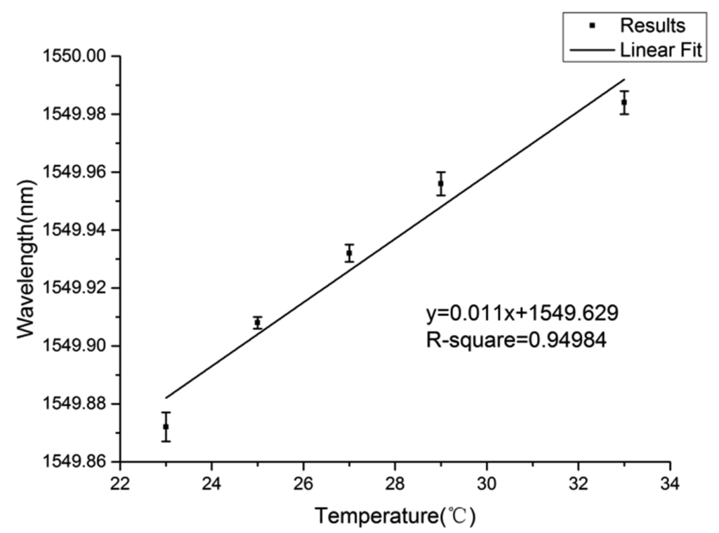 Based on the above calculations, we can conclude that for a system used for seawater temperature sensing, a larger fiber diameter and longer probing wavelength are preferred. Next, experiments are carried out to experimentally demonstrate the temperature sensing and validate the theoretical results, simultaneously.