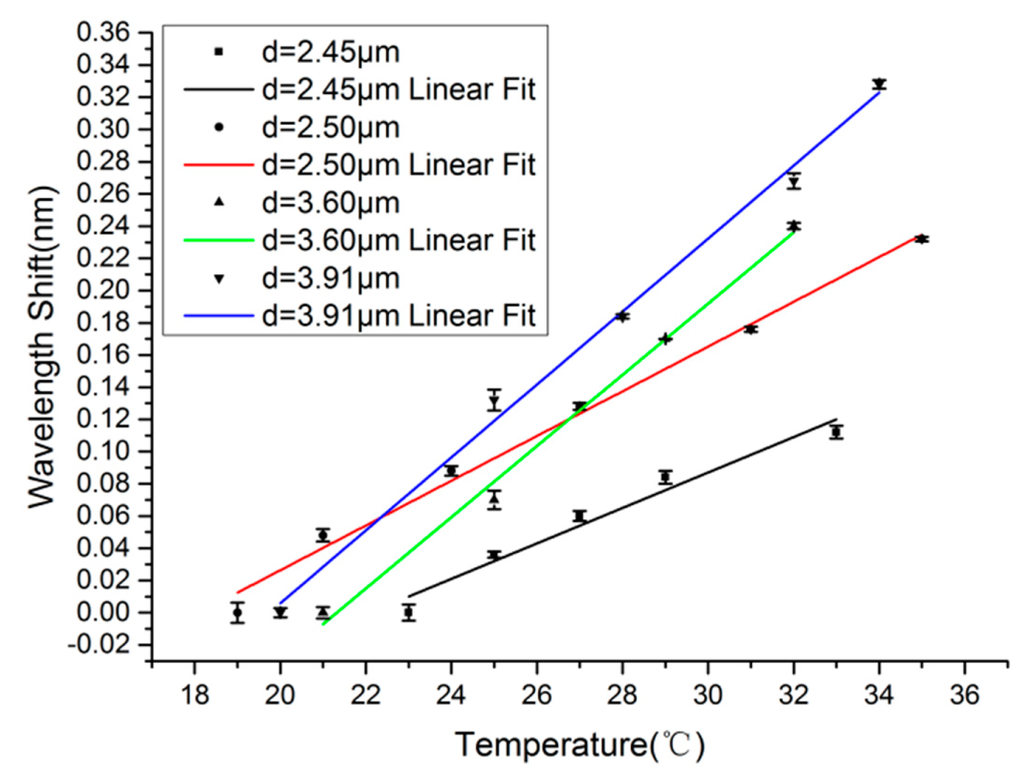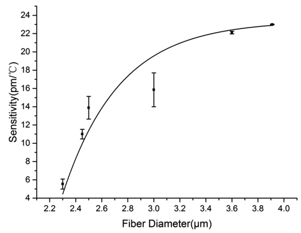 By a similar measuring method to that used in Figure 5, the linear fittings of resonant wavelength with temperature for MKRs with fiber diameters of 2.45-, 2.50-, 3.60- and 3.91-μm are shown in Figure 7. The measured sensitivities of these MKRs are 11.00, 13.89, 22.11 and 22.65 pm/°C, respectively, which indicates that larger fiber diameter results in higher sensitivity. To further show the dependence of sensitivity on fiber diameter, we plot their relationship in the fiber diameter range of 2.30–3.91 μm, as is shown in Figure 8. It can be seen clearly that the sensitivity of the sensor increases with the increasing fiber diameter, which is consistent with the calculated results.