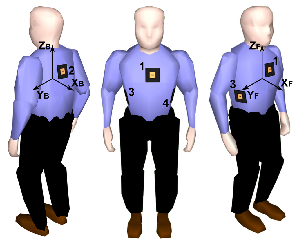 Four wireless nodes are integrated into a firefighter garment, deployed on the front, back, left and right sides of the body. The antennas radiate away from the body in different directions, providing spatial, as well as pattern diversity. The setup is illustrated in Figure 1. For clarity, only the front (1) and rear (2) nodes are initially taken into consideration. Given the relative orientation of the two nodes, the vectors of the x- and y-axes of both nodes will be opposite. The gravity vectors provide information about the orientation of the body of the rescue worker. The central access point is represented by a receiving node that relies on similar hardware as the mobile nodes, but now with two omni-directional monopole antennas connected to the inputs.