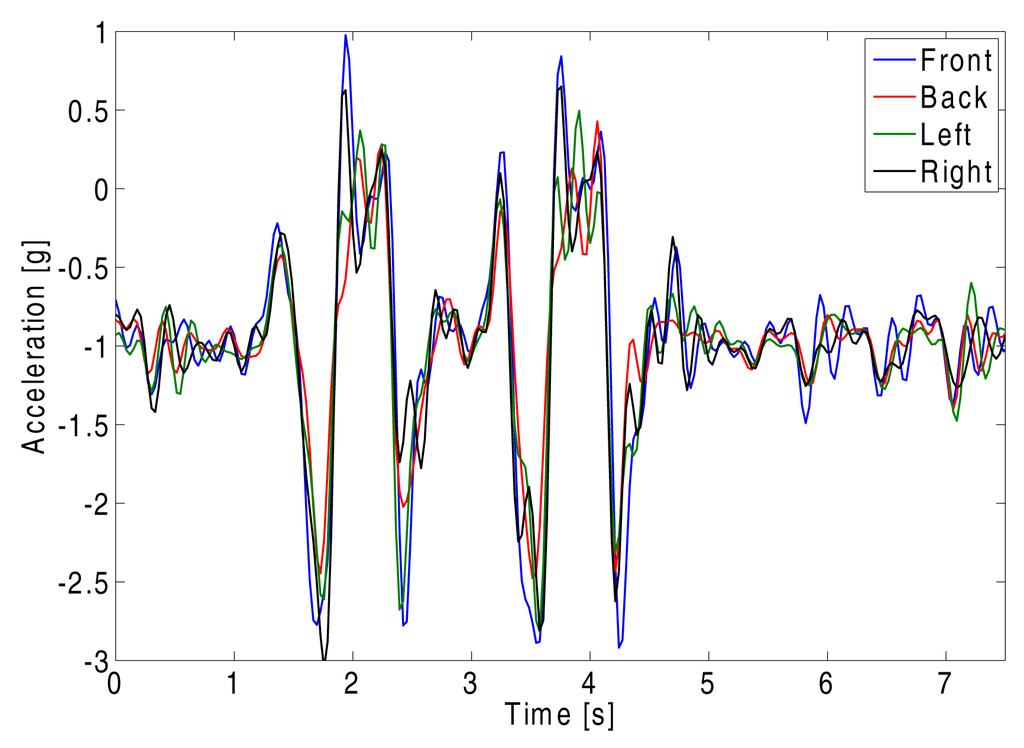 In Figure 10, the sensor data, acquired along the vertical accelerometer axes during a jump, are illustrated, in order to demonstrate the synchronicity of the measurements on all four nodes. Traces for the other axes are also synchronized, but have been omitted for the sake of graph clarity.