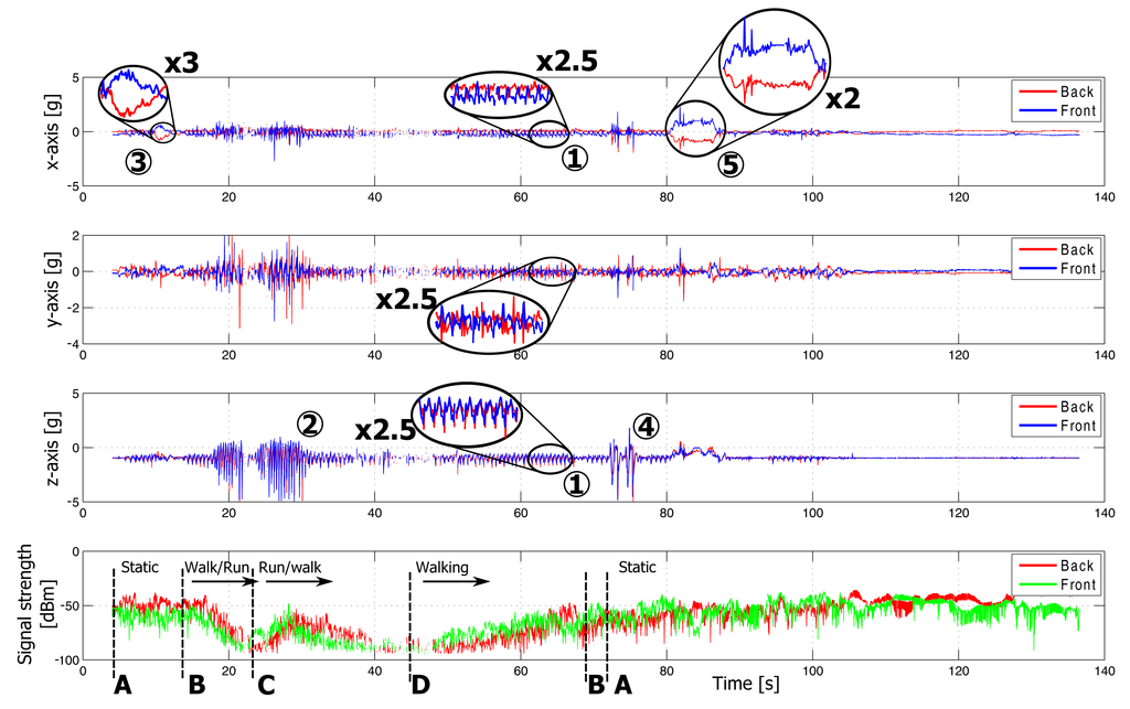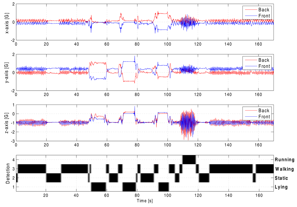 As can easily be verified in the unprocessed measurement in Figure 14, the classification algorithm successfully determines the user state in a computationally efficient way. Although detection on one on-body node is already remarkably accurate, the combination of data from all sensors in the on-body network further increases the reliability as a classification system for user actions.