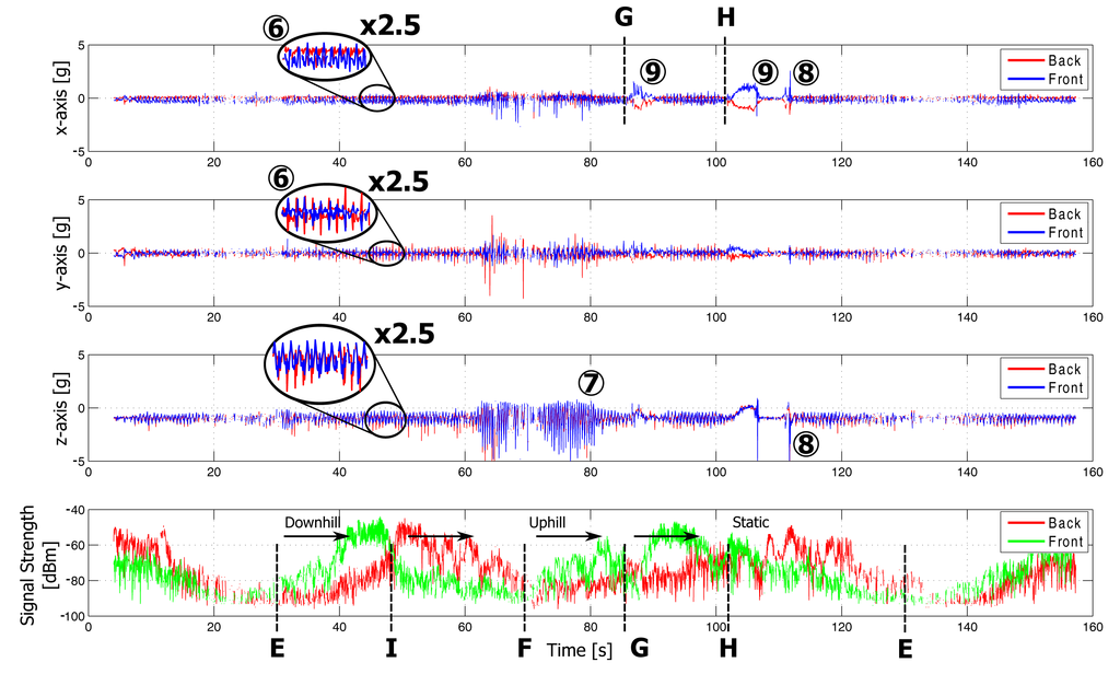 Jumping (4, 8) causes large accelerations along all axes of the accelerometers, especially along the z-axis of the test person, as seen in Figures 11 and 12. The test person climbs onto a wall and jumps down at Point H. In the indoor environment, the test person jumps up and down at Point B.