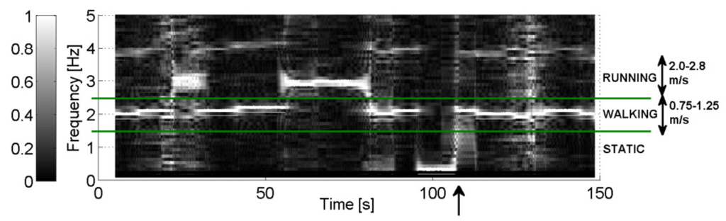 At a normal walking speed, a main frequency component of 2 Hz is observed, whereas 3 Hz is obtained when running. A person who is running takes larger steps, which explains why an approximately double speed results in an increase of the main frequency component by only a factor of 1.5. However, running is easily detected, because both the frequency and amplitude of the main spectral component significantly increase compared to walking. In a stationary position, a frequency component of 0 Hz (DC), is observed. This is clearly shown when the test person has climbed on the wall in the outdoor measurement. Accelerations for step counting are easily detected in the spectrogram. After the test person climbs the wall, the increasing main frequency component in the time needed to achieve normal walking speed is indicated by an arrow in Figure 13, illustrating the accuracy obtained by the sensor network.