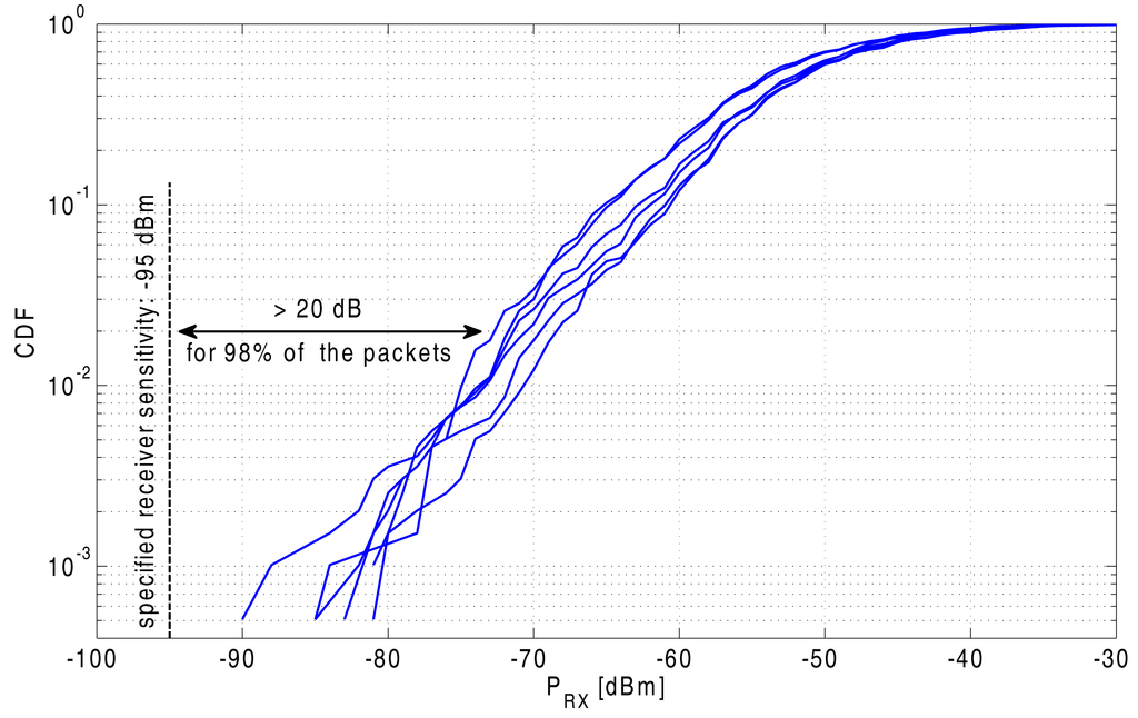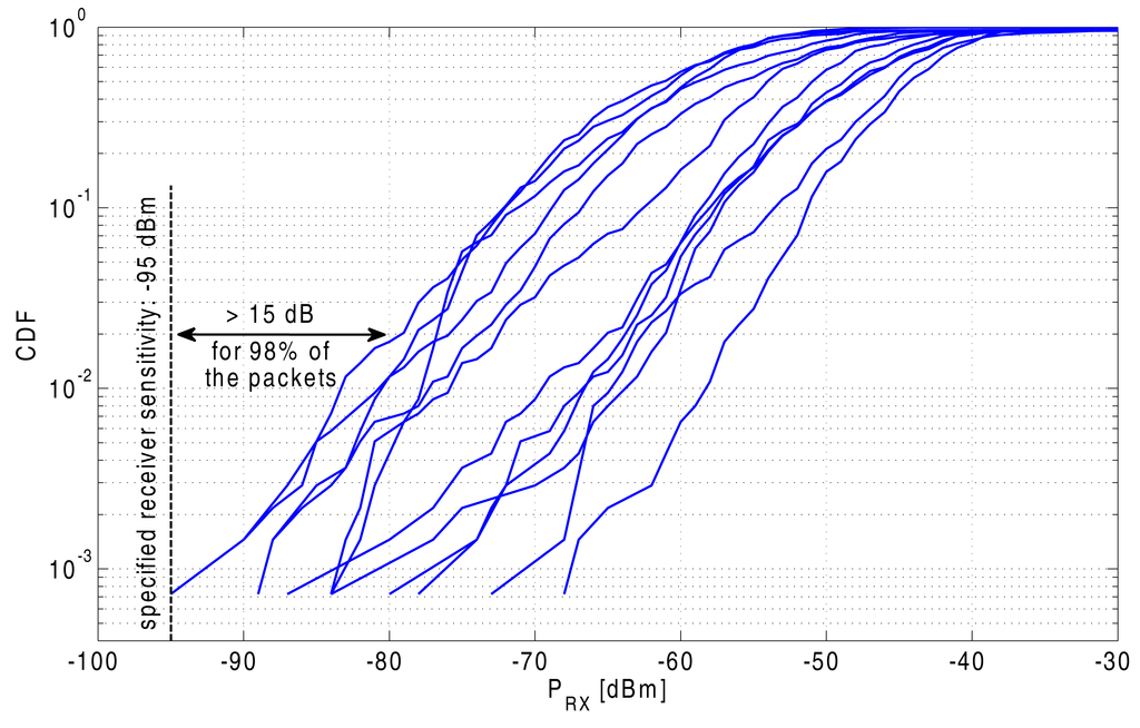 The cumulative distribution function of the received signal powers for the 12 node-to-node links is displayed in Figure 15. These curves illustrate that the signal level is at least 15 dB above the ADF7242 transceiver's specified receiving threshold of −95 dBm for 98% of the received packets.