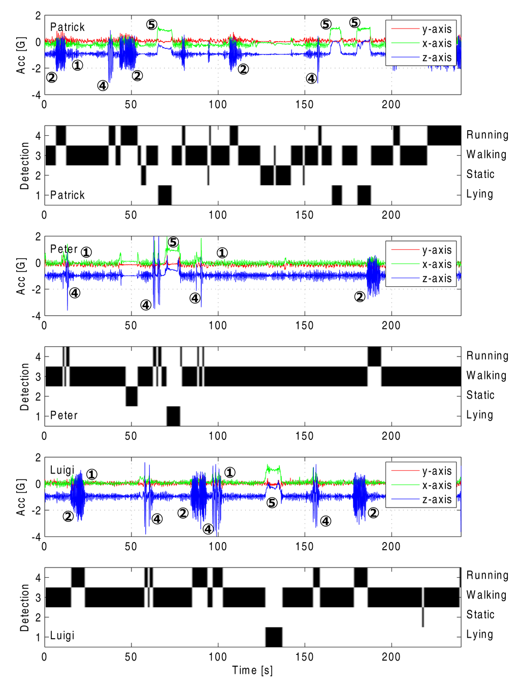 As a further assessment of the reliability of the wireless network and classification in the case of multiple persons, a measurement is performed employing three persons, each wearing one network node on the chest. The three persons are performing independent random walks within the same area, separated by varying distances of up to 20 m. The persons are all randomly switching between actions, such as walking, running, standing still, laying down and jumping, clearly illustrating the presence of separate persons. The computationally simple classification method is performed on the sensor data of the three persons, confirming its reliability for different test persons. Both the sensor data and the classification results are shown in Figure 16. The markers on the graphs refer to the actions, as described in Section 5. Although only one node is used for each person to measure accelerations and perform automatic classification, the computationally simple algorithm still performs very well.