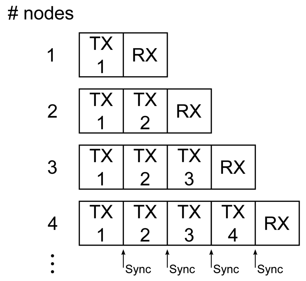 After the last transmitted packet of the transmission cycle, an extra receive time slot is preserved to listen for other packets from new nodes that can join the network, as displayed in Figure 2.