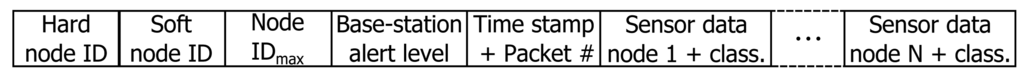 Data packet structure: The sensor data captured by the nodes are organized into a packet, as shown in Figure 4, transmitted by employing the IEEE 802.15.4 mode supported by the transceiver chip, automatically adding an error-detecting code, ensuring the correctness of the received data. The node's hard-ID corresponds to a unique fixed serial number for each physical node, whereas the soft-ID number was assigned automatically during the network enumeration process.