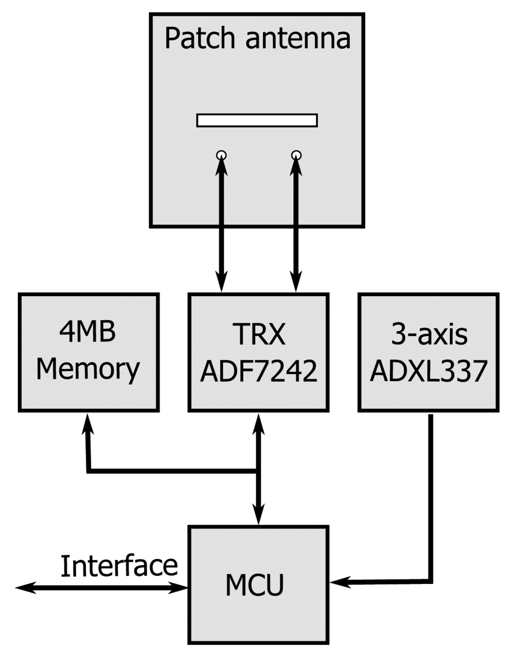 The state-of-the-art Analog Devices ADF7242 wireless 2.45 GHz ISM-band transceiver is used to set up the wireless data link. This is the first single-chip 2.45 GHz transceiver incorporating diversity, as well as IEEE 802.15.4 and GFSK modulation. The maximum output power of the ADF 7242 is limited to +4.8 dBm, which is well within the limits imposed by regulations (20 dBm, ETSI standard EN 300 328 [31] for wide band transmissions, such as in the IEEE 802.15.4-2006 mode). If desired, the range of the nodes can be significantly extended by increasing the transmit power up to the legal limit of +20 dBm. This option is discussed in the datasheet [32] of the ADF7242 transceiver chip and involves designing an integrated RF amplifier into the circuit.