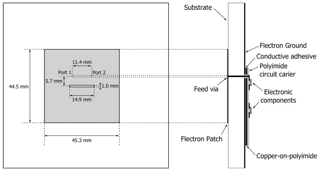 Figure 5a,b shows a prototype of an autonomous wireless sensor node completely integrated into a flexible garment-integrated patch and powered by a single battery. In Figure 5a, the front side of the wireless sensor node is shown, where the patch antenna is visible with its dimensions. Figure 5b gives an overview of the backside of the wireless sensor node; this side includes all of the electronic components mounted on the flexible substrate. We now discuss the various components composing the block diagram of the node in Figure 6.