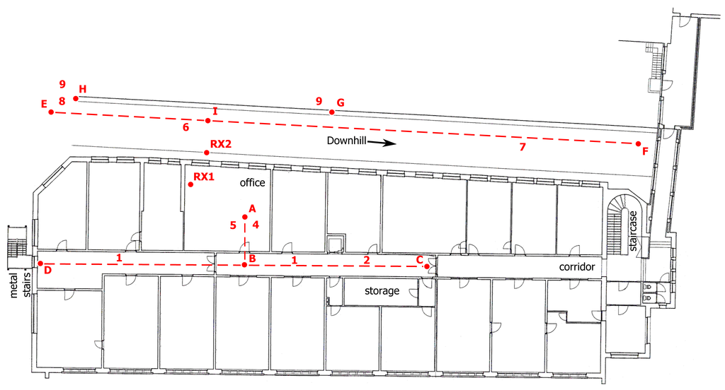 In the indoor office environment, the base station node is located at a height of 2 m above the office floor (RX1) and connected to a computer performing real-time data processing. The office at Ghent University is located on the first floor, consisting of solid brick floors and reinforced concrete walls. The floor plan of the office and its surroundings is given in Figure 9. Next to the building, there is a inclined street with its down-hill direction to the left, reaching the ground floor level at the right, surrounded by other buildings. In the outdoor environment, the receive node is placed outside the office building (RX2), along the inclined street, as illustrated on the floor plan in Figure 9.