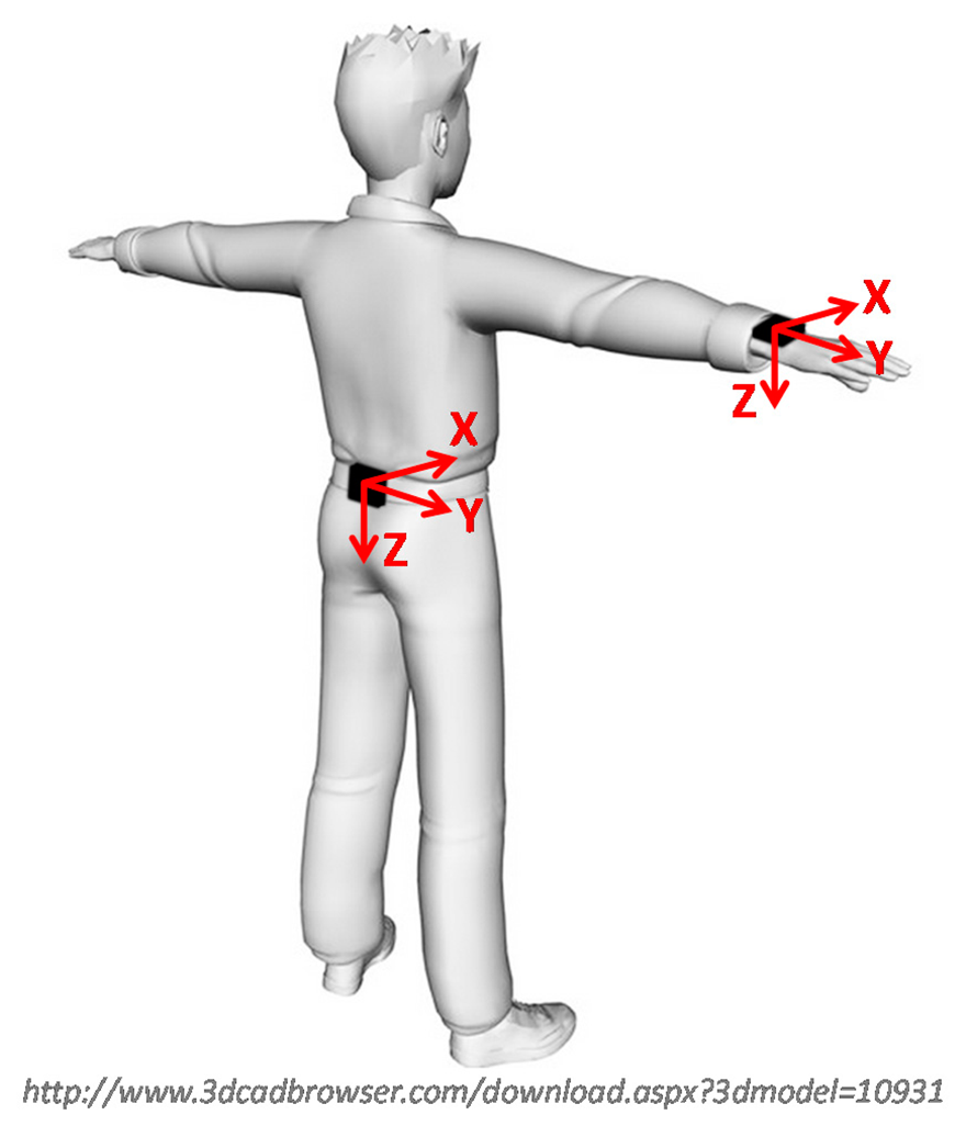 Before the trials, a MIMU (Opal, APDM Inc., Portland, Oregon, USA) containing 3D gyroscopes, accelerometers and magnetic sensors (± 6 g with g = 9.81 m/s, ± 1500 °/s and ± 600 μT of full-range scale, respectively) was secured using an elastic belt to the participants' lower back (L3–L4) for the locomotion trial and to the forearm for the manual routine trial (Figure 1). Angular velocity, acceleration and local magnetic field vector data were collected at 128 samples/s.
