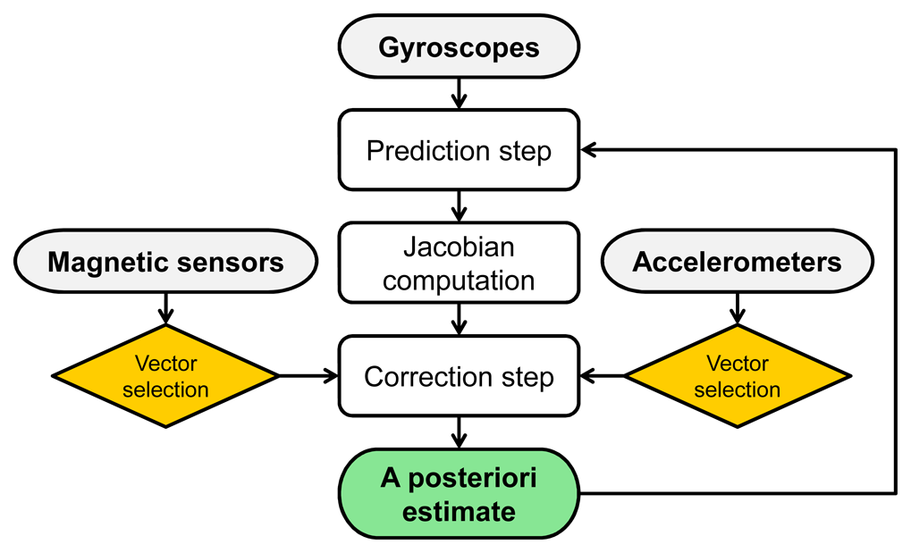 In the light of the previous considerations, the information provided by the three sets of sensors can be combined within a sensor fusion framework. Two main sensor fusion approaches have been proposed in the literature. The first is stochastic filtering, often implemented in the form of an Extended Kalman Filter. Given a model of the time evolution of the state of the system under analysis (the MIMU orientation) and of its noisy observations (the MIMU output signals), Kalman-based methods provide an estimate of that state [19]. The second approach is complementary filtering, which fuses multiple noisy measurements that have complementary spectral characteristics. For each measurement, the complementary filtering exploits only the part of the signal frequency spectrum that contains useful information [20]. In this case, the characteristics of the noise present in the process are not required to be modeled and incorporated in the algorithm.