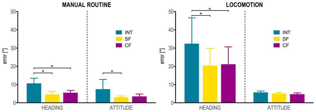 For the locomotion task, the ANOVA analysis showed a significant effect of the “method” factor for RMShead (F2,10 = 21.678, p < 0.001). The partial Eta squared was 0.81, indicating that the “method” factor by itself accounted for 81% of the overall variance in the dependent variable RMShead. Post hoc tests revealed significant differences between INT and both SF and CF (p < 0.05 for both methods). For the attitude error RMSatt, a significant “method” effect was also found (F2,10 = 5.255, p < 0.05), with a partial Eta squared of 0.51. However, according to the post hoc comparisons, no significant differences were observed between each pair of methods (Figure 4).