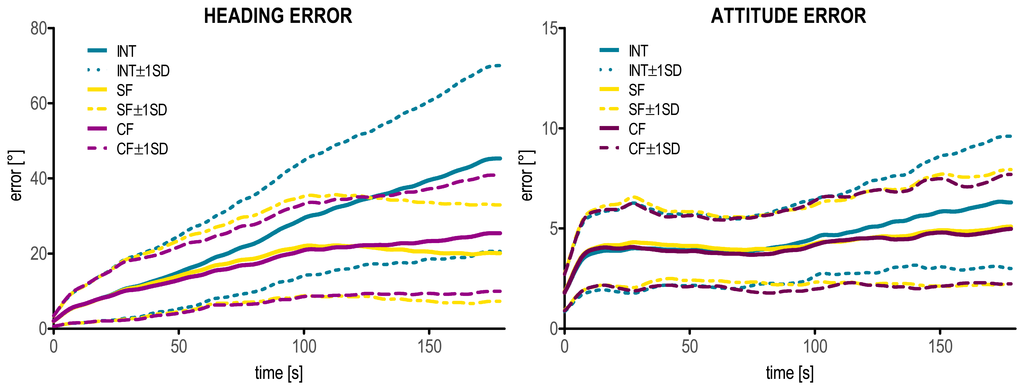 The results obtained for the attitude error during the locomotion task were somehow unexpected. No statistical difference between INT and the sensor fusion methods were found, probably because INT performs remarkably well providing an average RMSatt smaller than 5.5° and displaying a reduced drift error even after three minutes of numerical integration (Figure 5). Further investigation is needed in order to better understand which factors are actually involved in determining the amount of drift error associated with the integration of the gyroscope signals. However, the present results suggest that this drift depends not only on the time duration and on the standard deviation of the noise underlying the gyroscope signals [13], but also on the amplitude of the angular velocity itself. It can be speculated, therefore, that the reduced drift error associated with the attitude angle estimation are related to the reduced angular velocity values measured about the X and Y-axes during walking. In fact, during the locomotion trials, there is an uneven distribution of rotations about the three MIMU axes: in particular, the angular velocity about the vertical axis (more involved in heading estimation) was much higher (about 3.6 times) with respect to the other two axes (involved in the attitude assessment). Similar considerations can be drawn for the sensor fusion methods, as they both rely on the numerical integration of the gyroscope signals.