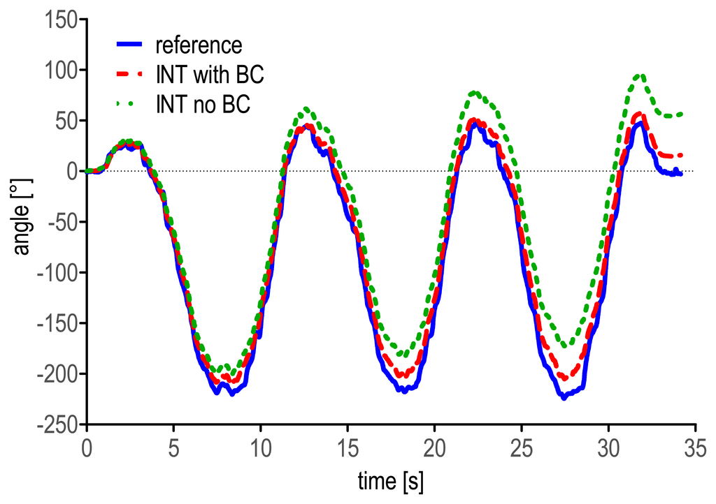 Correct the gyroscope static bias. Special attention should be paid to the correction of the initial bias of the gyroscopes. It is recommended first to switch on the MIMU at least 20 min before the beginning of the acquisitions to ensure that the device will have reached its working temperature when the experimental session starts, thus avoiding wide variations of the static bias due to heating effects [13]. Second, at least one static acquisition should be performed to compute the bias of the gyroscopes: if, after the MIMU positioning on the participants, a static phase can be identified in which the unit is reasonably still, such data can be employed for bias correction; otherwise the MIMU can be placed on a stable surface (e.g., on a table). The optimal duration of the static phase may depend on the electronics of the employed devices and, clearly, on the sampling frequency. However, to the authors' experience, five seconds at a sample rate of 100 samples/s can be considered as a sufficient duration. As an example of the influence of the bias correction procedure on the outcome accuracy, Figure 6 displays the heading angle of the MIMU on the lower trunk with and without the static bias correction, during three complete “figures of eight” of one selected trial of the locomotion task.