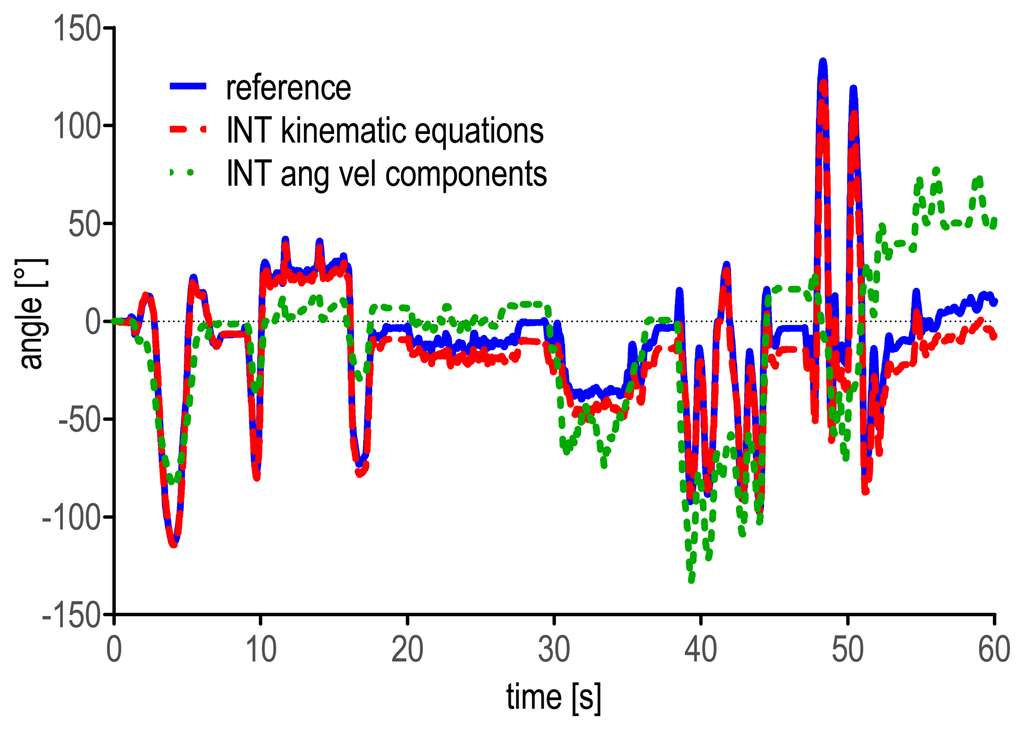 Integrate the kinematic equations, not just the components of the angular velocity signals. The kinematic differential equations that describe the relationship between the time derivatives of the selected orientation parameters and the angular velocity components (e.g., Equation (1) for quaternion representation) describe not only the changes in orientation of the local reference frame with respect to the previous one in each instant of time, but also the orientation between the local and the global reference frames in each instant of time. The latter information is missing when the numerical integration is performed on the components of the angular velocity signal separately [51]. Additionally, the angular displacements obtained in such a way do not represent Euler angles. When out-of-plane movements or large rotations about at least one of the three MIMU local axes are addressed, the piece of information neglected by the individual component integration can be crucial. Only when small rotations are involved and, thus, negligible changes in orientation between the local and the global reference frames occur, the results provided by the integration of the angular velocity components are comparable to those obtained by integrating the kinematic equations (this is the case, for example, of straight treadmill or over-ground walking using a MIMU placed on the lower trunk). Nevertheless, the integration of the kinematic equations should be always preferred, as more rigorous. As an example of the different results that can be obtained using the two integration methods, the heading angle obtained by integrating the kinematic equations and the angular displacement obtained by integrating the Z component of the angular velocity signal are reported during one randomly selected manual routine trial (Figure 7).