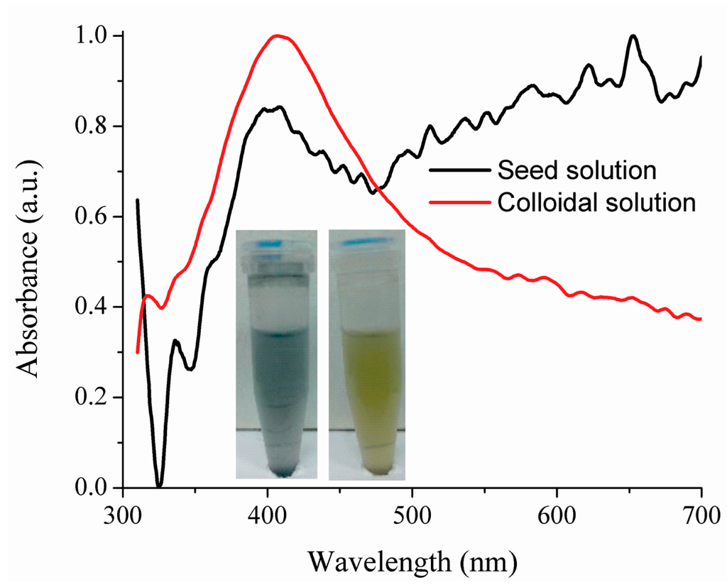 Absorption curves of seed and colloidal solution are shown in Figure 3. Regarding the colloidal solution this exhibits a well-defined absorption peak at 406.5 nm whereas the seed solution exhibits a peak absorption at 408.3 nm and the absorption begins to increase for longer wavelength. The yellow hue is related to the laser power and the number of irradiating laser pulses on the solution, it also depends on the concentration of the solution.