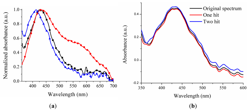 The stability of nanoparticles adhered on the optical fiber end was verified by subjecting the optical fiber end to strong oscillations. We take the optical fiber below its tip (approximately 5 cm), then it was hardly hit with the index finger. The response of the optical fiber sensor before and after hitting the fiber is shown in Figure 5b. In this figure one can see that the LSPR spectrum did not change after having beaten the fiber. This means that nanoparticles adhered on the optical fiber end are stable.