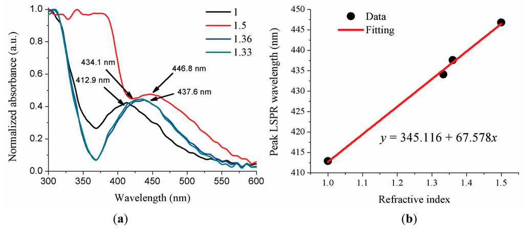 The sensitivity S of a LSPR sensor expressed in nanometers per refractive index unit (nm/RIU) is defined as the change in the LSPR peak wavelength maximum per unit change in the refractive index of the medium and it can be calculated by