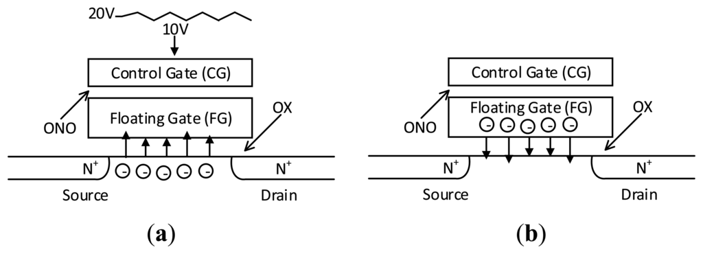 On the other hand, the conductivity of the oxide may be higher as the P/E cycle increases or the temperature rises. The electrons stored in the FG will leak into the base [36], as shown in Figure 1b. This will also change the reference voltage of the FG and damage the stored information. The leaked current can be calculated using Equations (1) and (2) [20], where A, B and Vthi are constants; E is the electric field intensity of the Control Gate (CG); Eox is the electric field intensity of the oxide; Cono and Cox represent the capacitance of ONO (SiO2−Si3N4−SiO2) and the oxide, respectively; Vth is the reference voltage of the cell and Tox is the thickness of the oxide. Through this model we can observe that the lower the reference voltage of the flash memory cell, the less current will leak. The BER of this cell also would be lower: