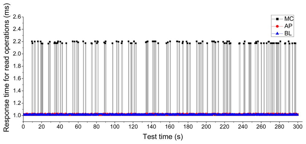 The response time of the read operation is another important issue. We used a workload with random accesses of 50% and a read operation of 50% to verify the performance of the Asymmetric Programming read operation. The workload lasted for five minutes. The experimental results shown in Figure 12 indicate that Asymmetric Programming can achieve nearly the same response time as the baseline scheme for read operations, while Meta-Cure has a response time over two times longer for read operations. This is because Meta-Cure must read one or more redundant backup pages for critical pages to restore the damaged metadata. That means an overhead cost of two or more times in the response time of read operations. We conducted this experiment using NAND flash with 1000 P/E cycles. As the P/E cycles increase, the uncorrectable page errors will also increase. The response time of Meta-Cure will increase correspondingly. However, Asymmetric Programming improves the reliability of metadata in the programming process without the need to conduct any extra read operations. Therefore, Asymmetric Programming will not cause any overhead in terms of response time for read operations.