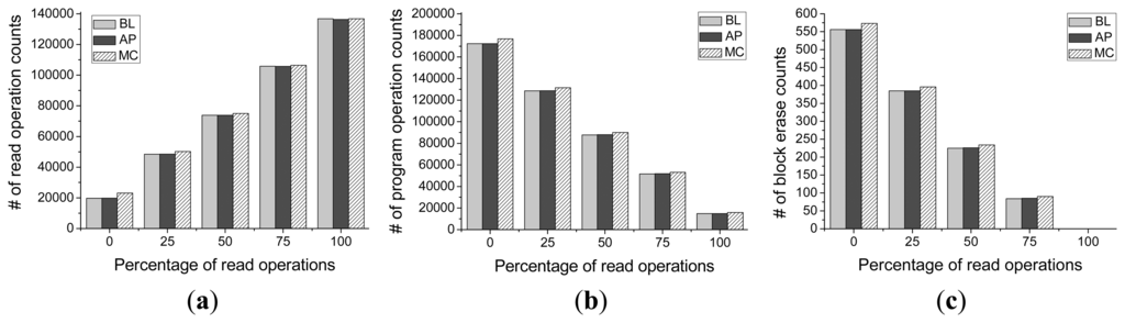 The total number of read operations and that of write operations are shown in Figure 13a,b, respectively. Compared with Figure 13c, we can clearly see that the number of block erase counts is affected by the number of write operations for the baseline scheme, Meta-Cure, and Asymmetric Programming schemes. In addition, the total number of read and write operation of the proposed scheme is still the same as that of baseline scheme and much smaller than that of Meta-Cure scheme. This result indicates that Asymmetric Programming scheme induces very few extra write operations when conducting request feedback operation. Also, by combining the results in Figure 14a–c, we can see that none of these three schemes are sensitive to the percentage of read/write operations.