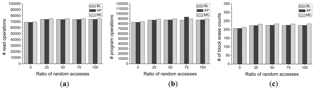 Figures 13 and 14 present the number of block erase counts and the total number of write and read operations with different percentages of read operations and different ratios of random accesses. From the results of Figures 13c and 14c, we observe that Asymmetric Programming can achieve almost the same number of block erase counts as the baseline scheme, which means that Asymmetric Programming will not induce overhead for the endurance of the NAND flash. This result also indicates that our proposed write algorithm (Algorithm 1) is very effective at improving block utilization and that it inserts most of the uncritical page data into the physical pages between the adjacent MSB pages by conducting request feedback operations using request queue scheduler.
