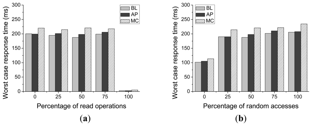 Figure 16 presents the worst-case response time of Asymmetric Programming with different percentages of read operations and different ratios of random accesses. For our Asymmetric Programming scheme, the request with worst-case response time takes place when the request queue scheduler delays the current write request to serve the next request (as shown in Algorithm 1) and the garbage collection process is triggered at the same time. This request feedback operation may be conducted several times. Thus, the worst-case response time would not be constant with different workloads.
